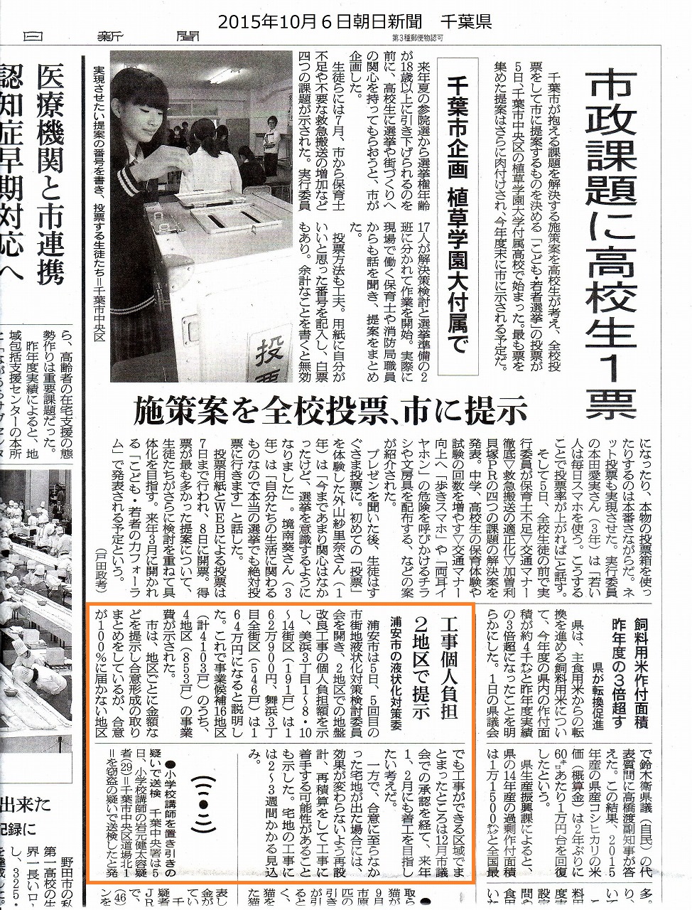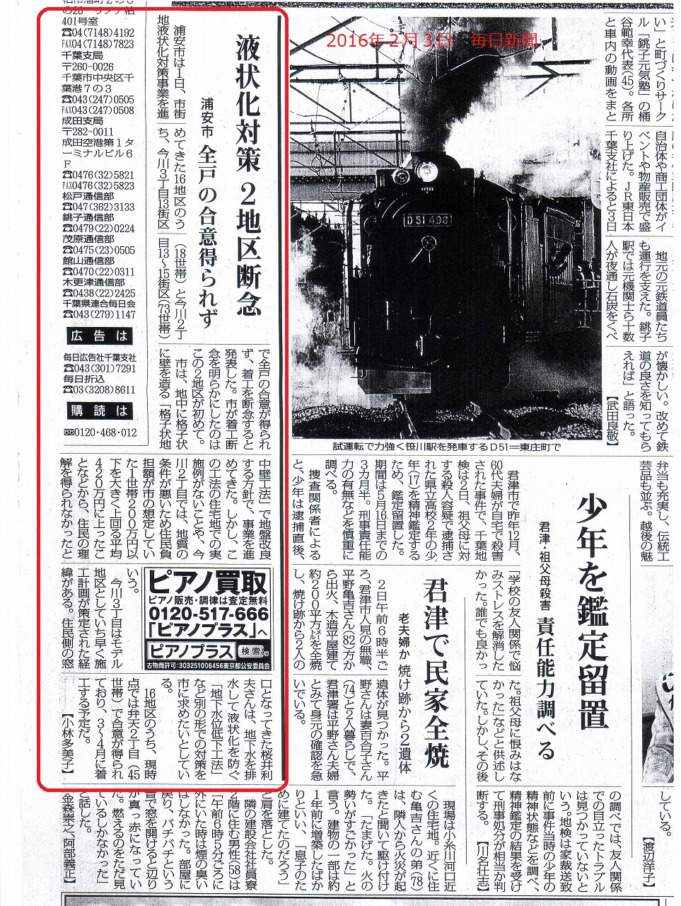 この記事の意味するものは何か、スキームの妥当性について市は原点に立ち返り工法の再検討をする時点にきているものと思う。浦安市同様の液状化問題を抱える千葉市では、着々と対策が進んでいる。また、格子状工法ではなく、3mの地下水位浅層低下工法の実証を兼ねた実証試験工事を通じて住民が手を上げやすいように図ってもいる。